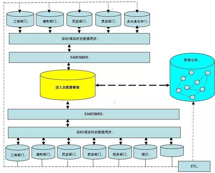 法人主数据管理架构中,法人主数据管理居于核心位置,为数据仓库和各部门、行业的业务应用提供统一的法人基础信息服务。