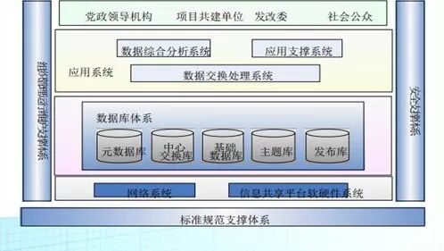 总体架构由支撑体系(标准规范支撑体系、管理运行维护支撑体系、安全支撑体系)、网络系统、信息共享平台软硬件系统环境,数据库体系(中心交换库、基础数据库、主题库、发布库、宏观经济数据库管理系统、元数据库系统)、应用系统(数据交换处理系统、应用支撑系统数据、综合分离系统)组成。