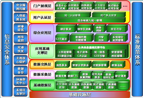 基础数据层:各类业务部门数据库的集合,如公安基础数据、计生基础数据、社保基础数据、医疗基础数据等。