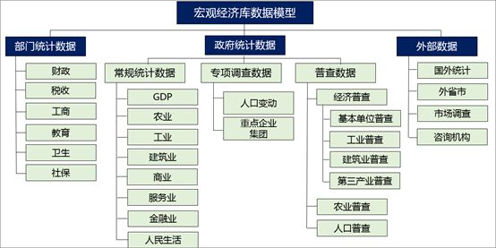 宏观经济数据库主要包括两大类部门数据和类别数据。宏观经济基础信息库中的部门数据信息反映从各部门采集、清洗、比对后的信息,信息的存储按照数据部门来源划分。类别数据信息是按照经济、社会、居民生活等数据类型进行存储,同一数据类别的信息可以来源于多个部门。