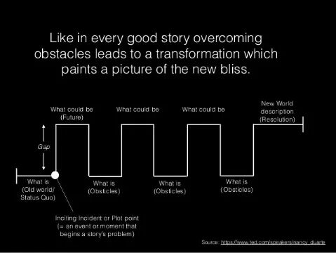 她建议给客户的报告演示也应该遵循这样一种“现况 / 最佳状况”的叙事模式,通过描述现实的惨淡,未来的美好,突出两者之间的巨大差异,制造兴趣和悬念。