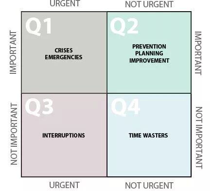 Q1的任务不能避免,又很紧急,比如有严格截止日期的紧急任务、家庭事务、健康问题等,采取积极主动的态度,是节省花在这部分时间的最好方法。
