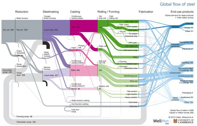 对钢铁行业的产业链进行了详细的拆解。不同粗细的线条也体现了钢材从原料到最终成品的不同流向。