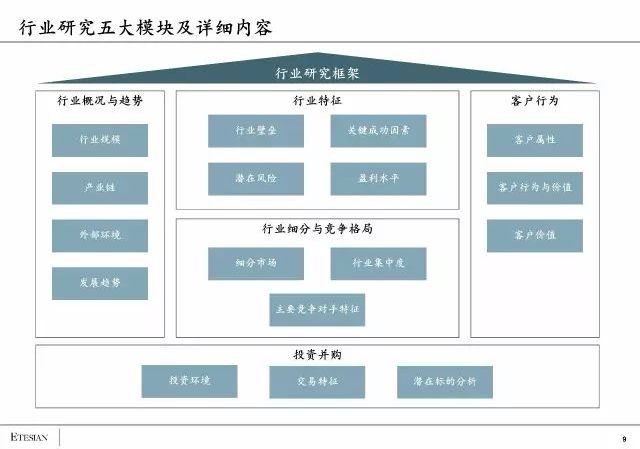 与其他模块相比,投资并购在行业研究中的地位相对独立,因为此类研究主要针对的客户群体是投资并购基金。
