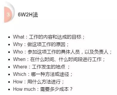 意义:做任何工作都应该从6W2H来思考,这有助于我们的思路的条理化,杜绝盲目性。我们的汇报也应该用6W2H,能节约写报告及看报告的时间。