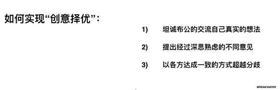 人和人不一样,每个人的观点不同,怎样从各种各样的观点中,选择最优的观点,这是决策过程当中,需要最为关注的一个问题。当你发现跟别人有分歧的时候,你怎么去思考别人与你不同的观点,然后经过讨论和学习,最终让最优的想法胜出。这是我们桥水公司成功最关键的一点,我们相信,这是我们最值得学习的。