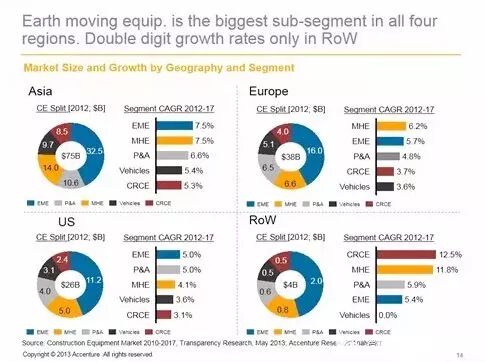 一般PPT的标题都是短语,比如“xxx牌汽车的市场份额”;而咨询PPT的标题栏则是对整页内容的凝练,比如下图中“土方机械在各地区都是最大的细分市场,在世界其他地区呈两位数增长”。