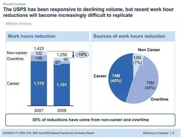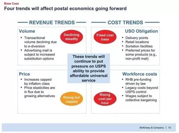 咨询师需要结合很多不定性因素来解决复杂问题。所以,一定要把想法和细节整理到一个全面的框架。这个框架应该易于抓重点和storytelling,比如会计损益表和资产负债表,就比较容易做到这一点。如下图,通过彩色标示,观众可以看到哪些收入和支出的趋势不利于USPS提供affordable的全球服务。