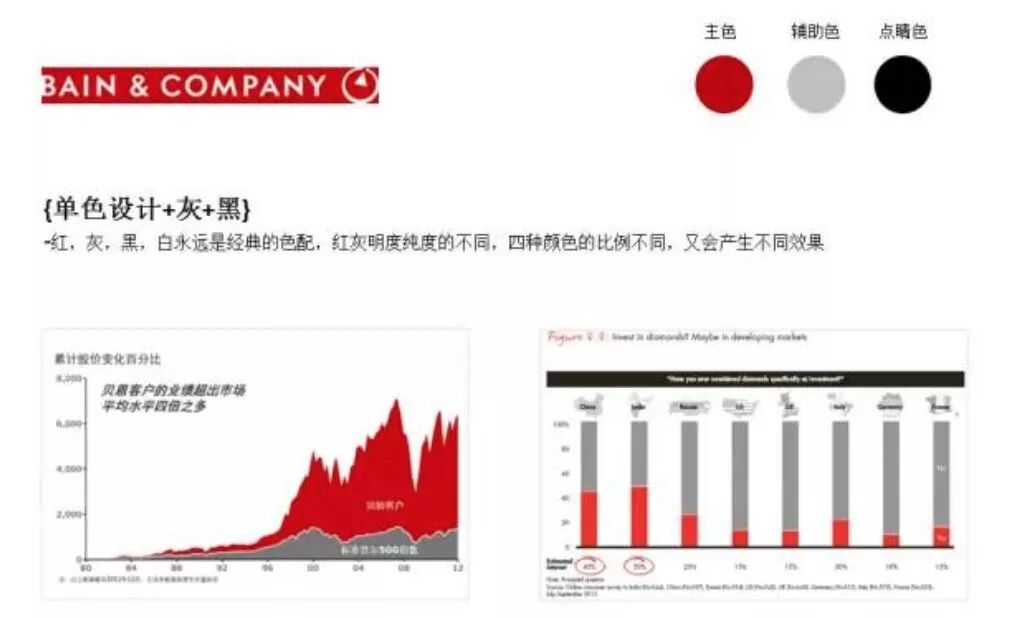 贝恩公司的PPT主要用红色贯穿前后。除了红色之外,还搭配了浅灰色,黑色两种无彩色。浅灰作为辅助色,黑色则起到了点缀的作用。