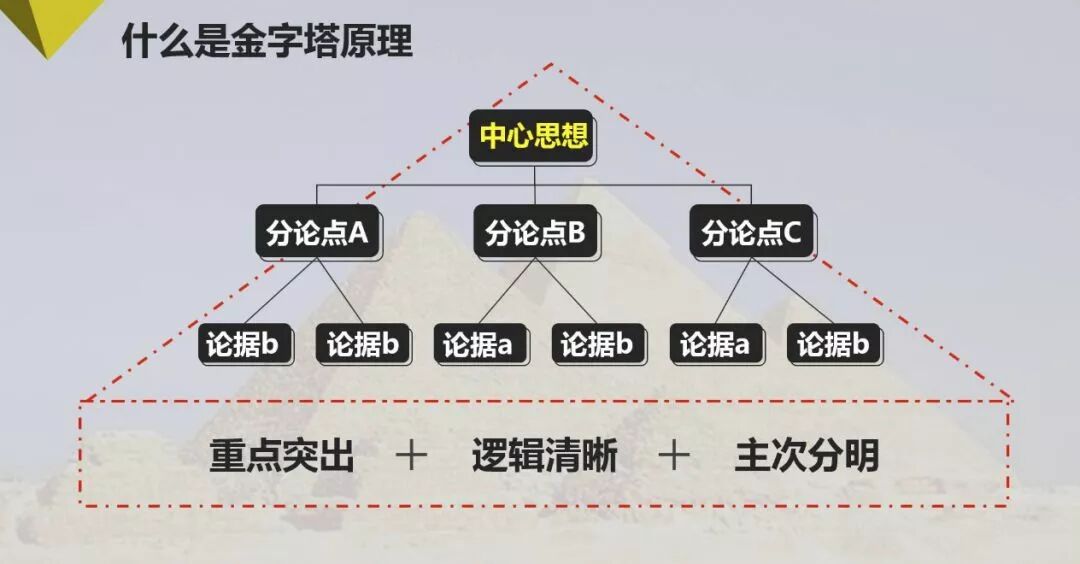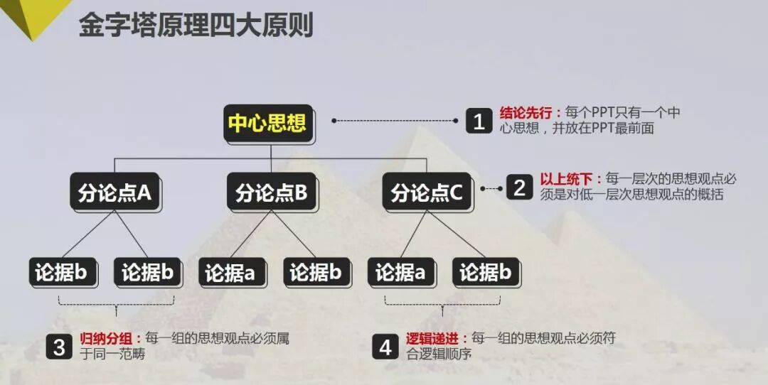 它的基本形式结构就是:一个中心思想,下面是分论点,然后下面是它的论据。采用金字塔原理最直观的三个特点就是让PPT的思想观点:重点突出、逻辑清晰、主次分明。