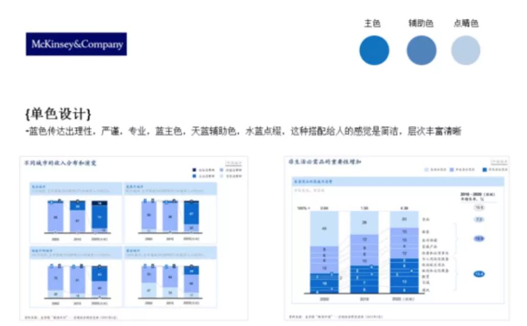 麦肯锡公司选用的是单色设计。蓝色作为主色,天蓝辅助色,水蓝点缀。这种搭配给人的感觉是简洁,层次清晰。