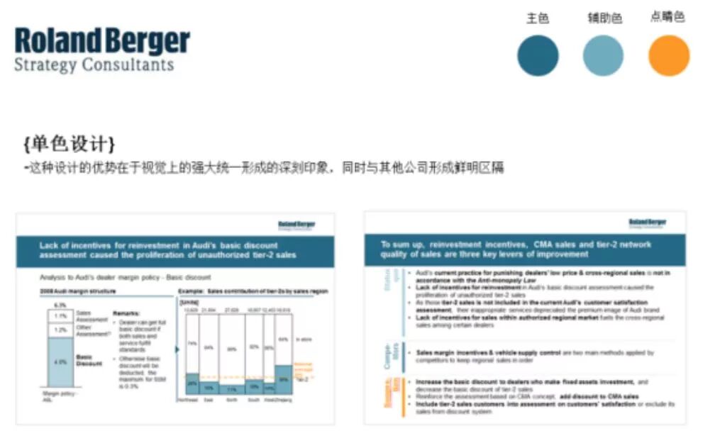 从上述顶级咨询公司的PPT模板来看,每家的PPT都采用的是单色设计,让整体的PPT从头到尾只有一种颜色或同一色系。这种设计的优势在于视觉上的强大统一形成的深刻印象,同时与其他公司形成鲜明区隔。