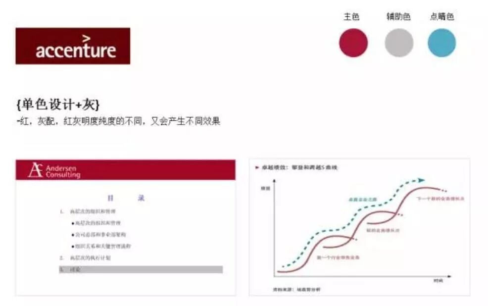 埃森哲最新的PPT模板中,主要有有深红色,灰色,采取的也是单色设计。不过埃森哲的PPT色彩管理并不统一,还有蓝色,黄色,绿色等多种版本。