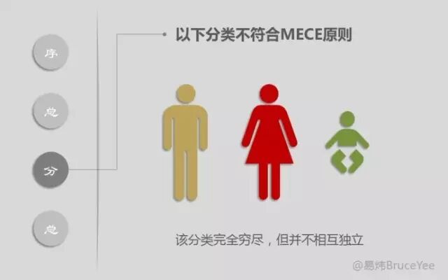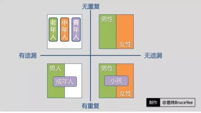 比如上面那张图,对客户的分类如果按男和女来分,的确是满足MECE原则,但仅仅这么分对于我们的营销策略有什么帮助吗?不管走到哪一步,请时刻记住【以终为始】,不要因为走得太远而忘了当初是因为什么出发!从营销的角度来看,你可能还要按职业、收入、年龄、居住区域等要素进一步细分,才有可能得出你想要的东西。