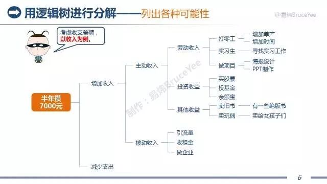 把一个已知问题当成树干,然后开始考虑这个问题和哪些相关问题或者子任务有关。每想到一点,就给这个问题(也就是树干)加一个“树枝”,并标明这个“树枝”代表什么问题。一个大的“树枝”上还可以有小的“树枝”,如此类推,找出问题的所有相关联项目。逻辑树主要是帮助你理清自己的思路,不进行重复和无关的思考。