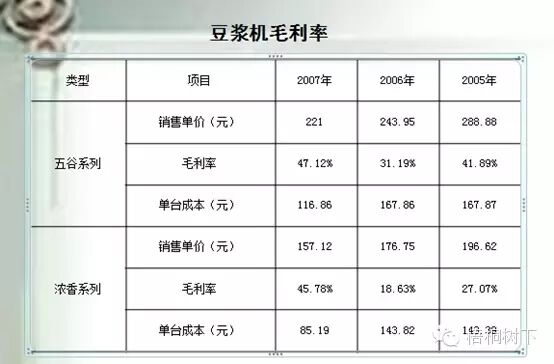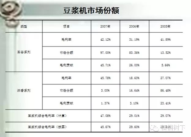 某国内豆浆机的龙头企业,2008年上市,其招股说明书称2005年该公司推出新产品五谷系列,相比较原浓香系列产品来讲,该产品价格高,且成本低,且近三年来五谷系列产品销售量占公司豆浆机产品销售总量的比例也在逐年提升。